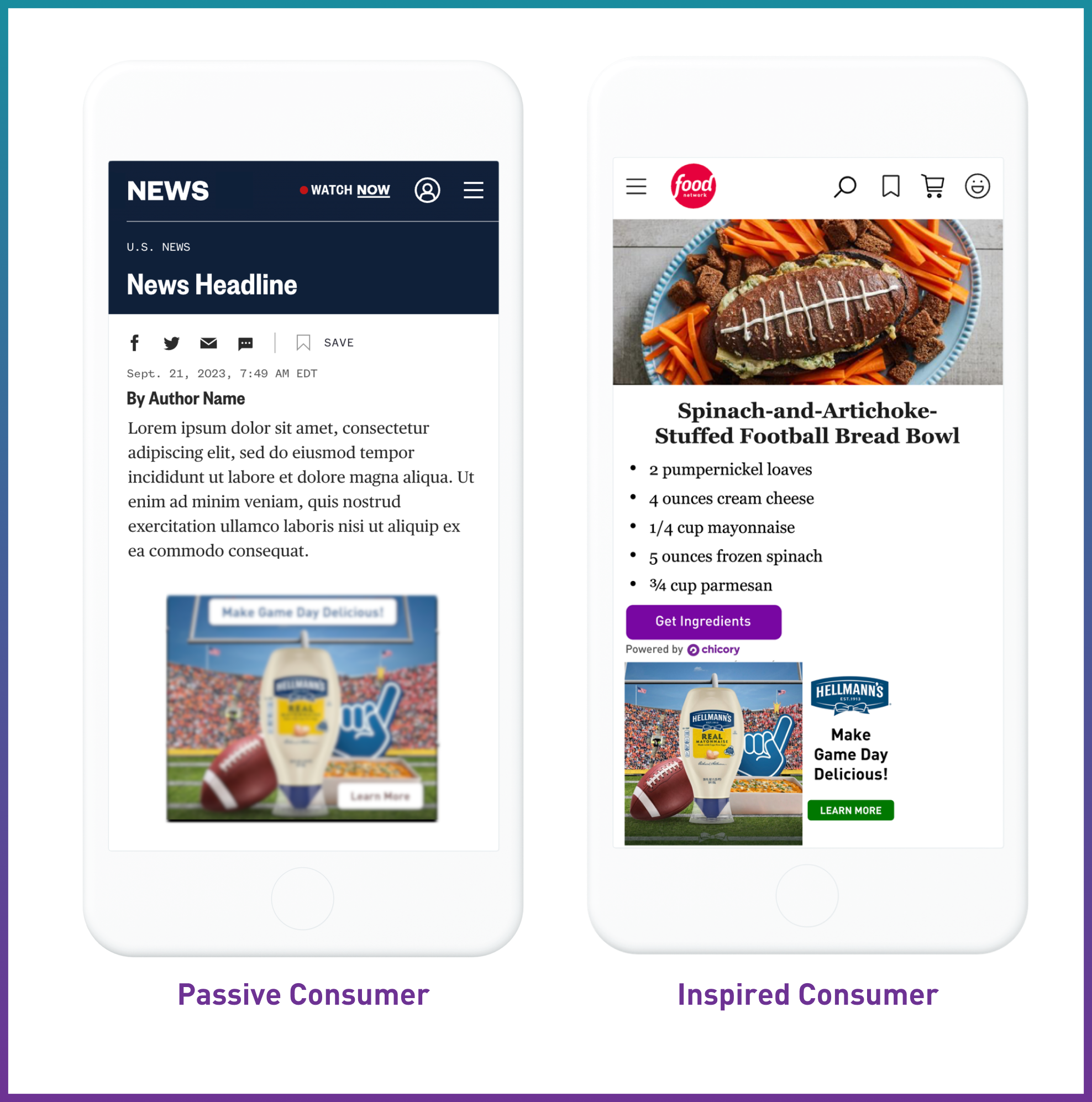 By serving contextually relevant, brand safe content, you are meeting consumers where they are, in an integrated way. Meanwhile, contextual commerce media is non-disruptive and does not obstruct the consumer’s natural viewing experience. Chicory leverages proprietary recipe placement to serve engaging and highly viewable ads in a contextually relevant environment. Incorporating relevant ads will enhance the experience for the consumer, and making those ads shoppable only increases efficiency.