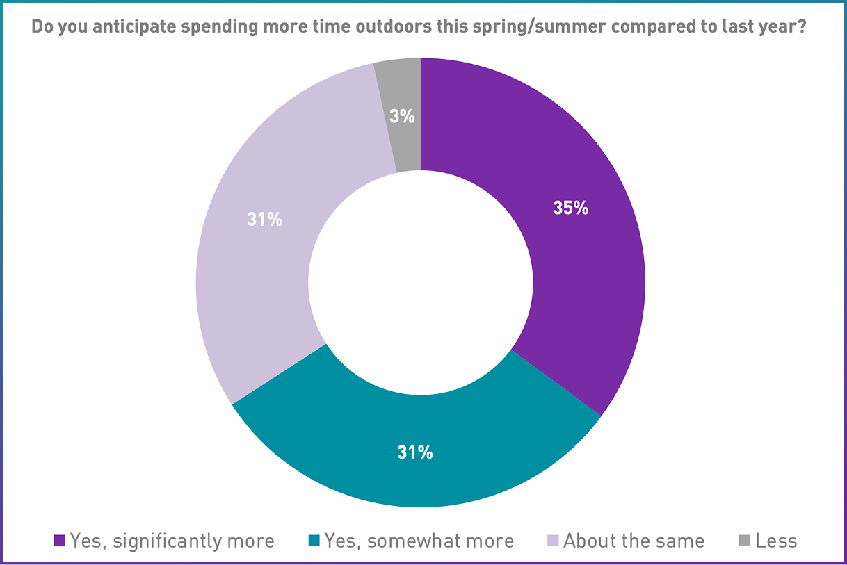 In fact, 59% of consumers say they’re more likely to do a deep spring clean this year compared to previous years, and 33% expect to spend more on cleaning and organization products this spring. 66% anticipate spending more time outdoors — with 35% planning significantly more outdoor time.