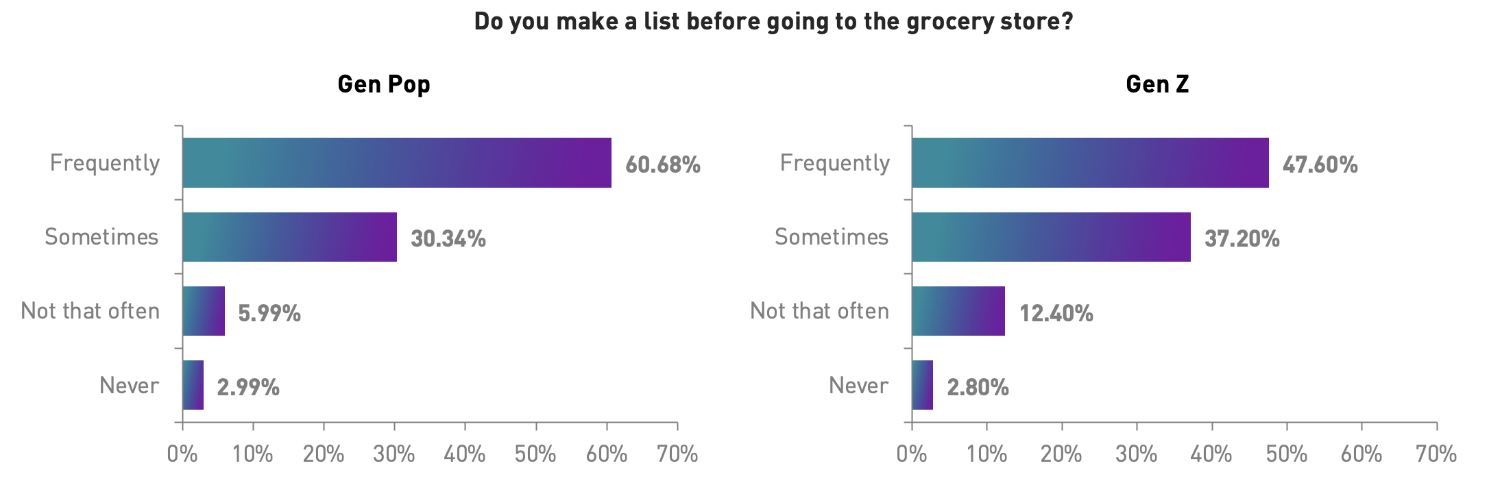 A vast majority of both Gen Pop and Gen Z shoppers are creating lists before going to the grocery store. This speaks to how critical it is for brands to reach them when they are actively making their list. This is a prime, pre-shop opportunity to reach consumers when it matters most.