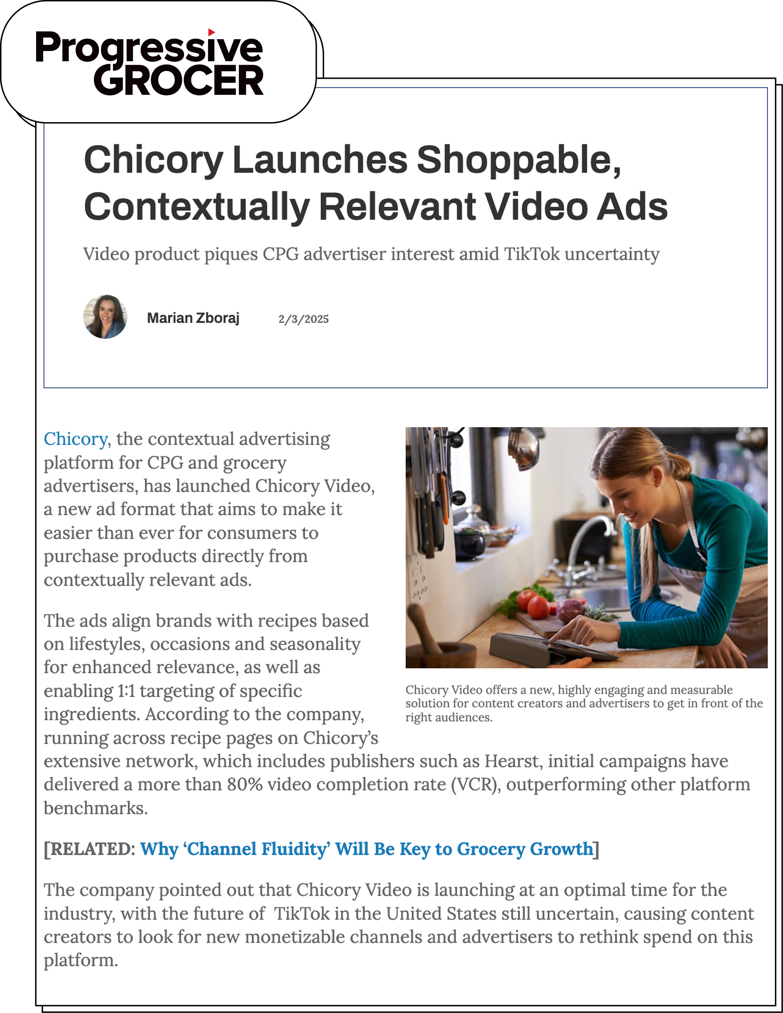“Our new video solution seamlessly combines the power of contextually relevant content with the ease of shoppability, and the attention-grabbing impact of video,” said Joey Petracca, Chicory COO and co-founder. “We know that over half of U.S. consumers use recipe websites and food blogs on a regular basis, and our product will help advertisers and content creators to capture and convert today’s video-first audiences.”